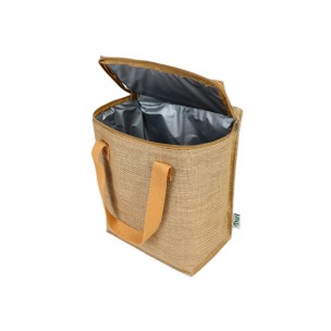 Bolso cooler con exterior de Yute e interior térmico aislante de PEVA y acolchado con esponja PE FOAM. En la tapa, sección superior del cooler, viene con una ventana cosida de eco-cuero, para aplicar logo de manera más elegante.