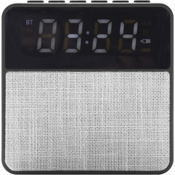 0,5 x 10,6 x 3,6 cm. Parlante/bocina, reloj y radio. Plástico con tela. En la parte superior botonera de: reloj que permite configurar la hora, botón para atender llamadas, botón de modo que permite seleccionar bluetooth, radio FM, tarjeta TF y entrada auxiliar, botón de volumen (+) y (-) y botón de play/pausa. Pantalla con luz led blanca que muestra la hora, modo seleccionado y estado de bateria.
