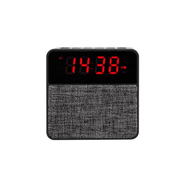 Altavoz inalámbrico con Radio FM, Reloj y Alarma. Potencia 4Ω 3W * 2, Bluetooth 4.0, alcance de Transmisión 10m., Batería recargable Li-Polymer de 1200mAh (3.7V), Tiempo máximo de reproducción 5 horas aprox. Incluye cable y salidas USB / Micro USB y cable de conexión AUX. Incluye Radio FM, lector SD Card y función para responder teléfono celular. El mejor sonido para tu música favorita!!