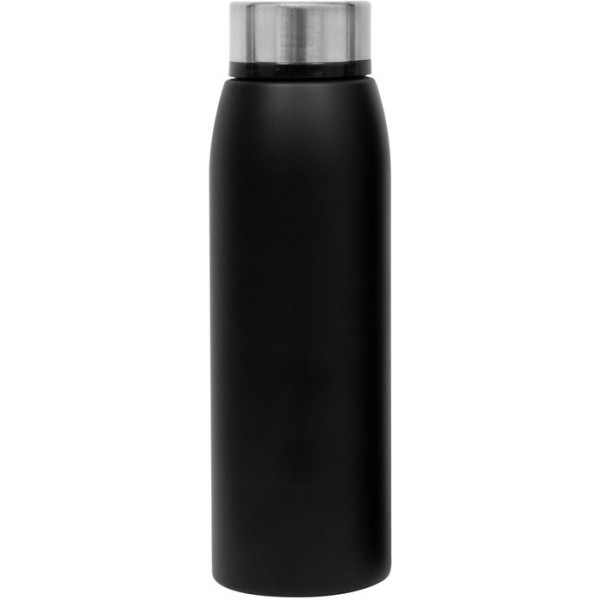 7 x 23,5 cm. Capacidad 500 ml. Botella Térmica/Vacuum. Doble pared, acero inoxidable interior 304 y exterior 201. Cuerpo color negro y tapa a rosca de aluminio. La tapa tiene el exterior de acero inoxidable 202 y el interior de plastico. Viene en caja de regalo. .Mantiene hasta 12 hs la temperatura de las bebidas calientes y 24 hs de las bebidas frías.