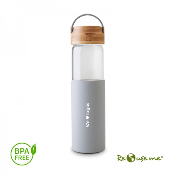 Botella reutilizable de vidrio, con tapa de bamboo y funda de silicona. Cuenta con un agarre en su tapa para su transporte. Producto libre de BPA. Medidas: 22,6 cm x Diámetro 6,8 cm. Capacidad: 550ml.