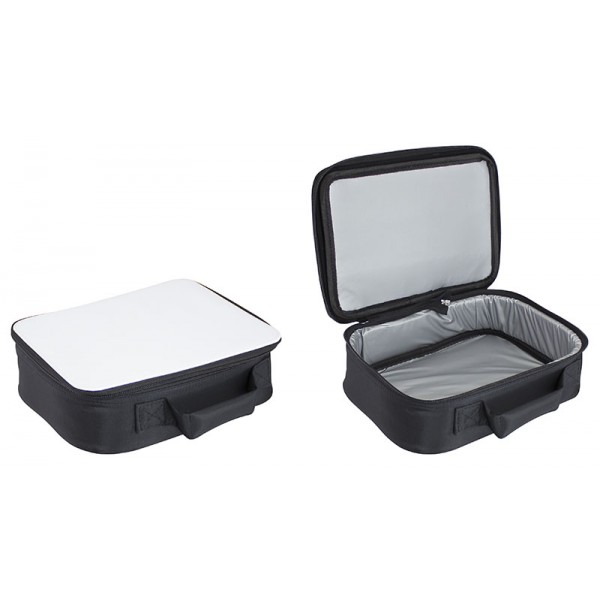 Lonchera de Microfibra, con interior cooler con aislante térmico plateado. Incluye mango y tapa dura en tela blanca para Sublimación a todo color. Cierre eclair.