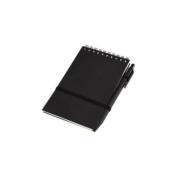 Libreta Ecológica con tapas de cartón reciclado, 70 hojas interiores blancas (croqueras). Incluye cierre elásticado y bolígrafo ecológico.
