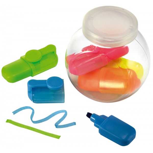 Set de 5 destacadores de colores, en frasco de plástico transparente con tapa frozen. Ideal espacio para logo en la tapa.