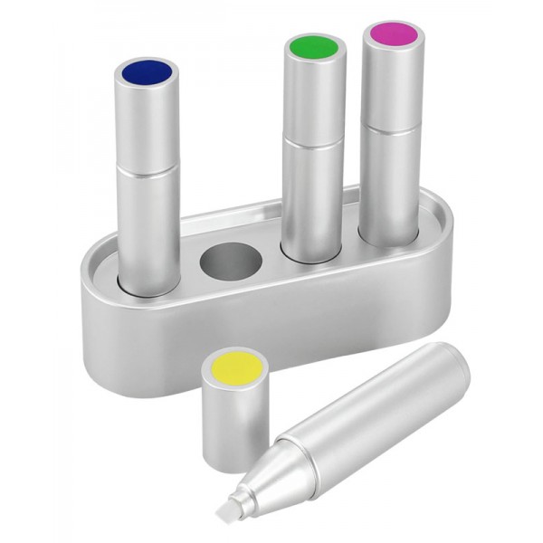 Set de 4 destacadores de color, sobre base plástica plateada. Presentación en caja de regalo color plata.