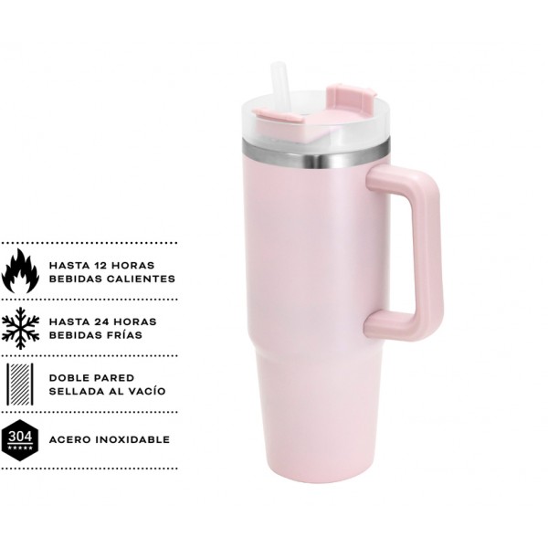 8,8 cm x 24 cm. Capacidad 880 ml. Acero inoxidable y PP. Mug doble pared, sellado al vacío con sorbete. Tecnología Vacuum. Interior en acero 304 y exterior en acero 201. Tapa plástica transparente a rosca con anillo de silicona.