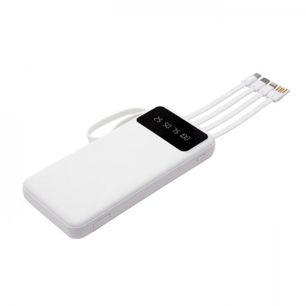 14,6 x 6,7 x 2 cm. Capacidad: 10000 mAh. Plástico ABS. Powerbank multipuerto. Cables de carga incorporados. Entrada: 5V/2A.