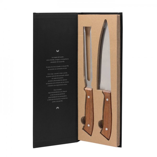 37,8 x 13 x 2,8 cm (caja cerrada). Acero inoxidable 420 y Madera de Acacia. Set de 2 utensilios: Cuchillo chef de 33,5 cm y 175 g. Tenedor de 31,3 cm y 125 g., ambos con mango de madera. Presentación en caja de regalo estilo libro.