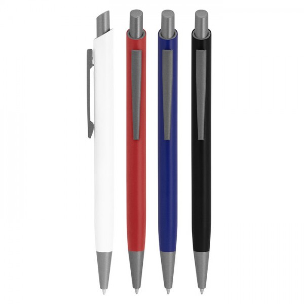 Aluminio, ABS, Acero. Boligrafo retráctil. Cuerpo revestido en laca de diferentes colores. Acabado mate. Pulsador, clip y puntera de color gris gun metal. Tinta azul. Amplia área de impresión.
