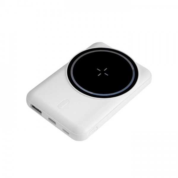 Power bank inalámbrico con aro magnético y soporte de anillo. Color blanco mate y negro brillante. Posee Entrada y salida: 5V 2A. Con 2 puertos de carga USB-C y micro USB. Función inalámbrica magnética. Potencia inalámbrica: 5W. Indicador luz led de carga. Soporte plateado rebatible al dorso. Cable de carga USB-C de 30 cm. en color blanco.