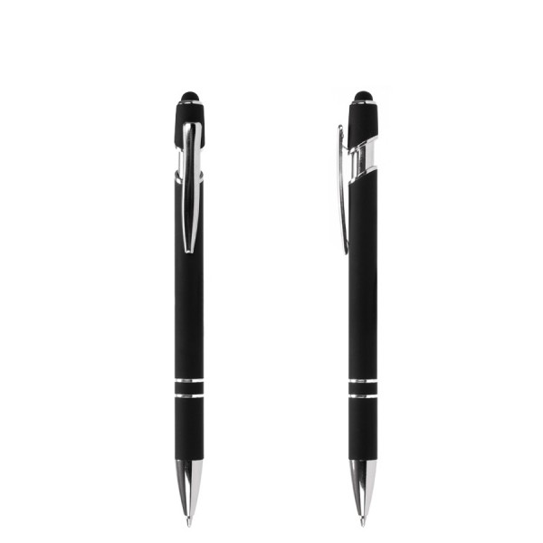 Bolígrafo metálico con cuerpo negro terminación «rubber» y terminal «touch-screen». Escritura azul.