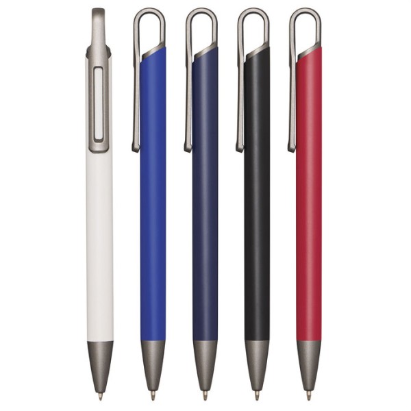 Un clásico renovado. Boligrafo retráctil. Cuerpo metálico en diferentes colores. Acabado mate. Clip pulsador y puntera de color gris gun metal.