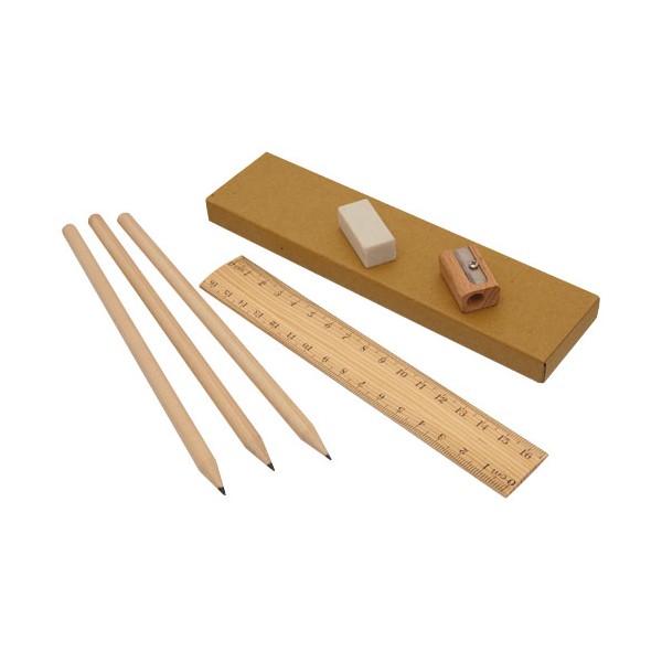 Set Escolar Ecológico. Incluye 3 lápices grafito negro largos de madera + 1 regla de 16.5 cm. de madera + 1 sacapuntas de madera + 1 goma de borrar. Presentación en Estuche ecológico de cartón reciclado.