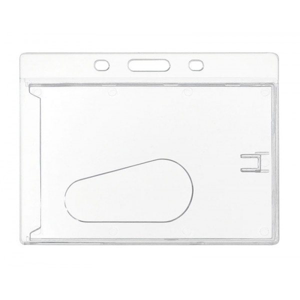 Porta-Credencial de Acrílico transparente, para Credenciales tamaño Tarjeta de Crédito. Presentación horizontal.