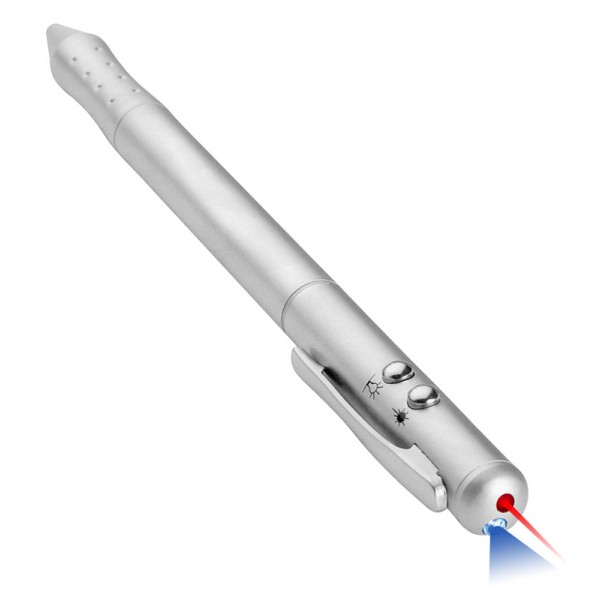 Bolígrafo metálico multi-función 4 en 1. Incluye bolígrafo, linterna LED, puntero láser y puntero PDA (Palm). Presentación en estuche de aluminio. Escritura Azul.