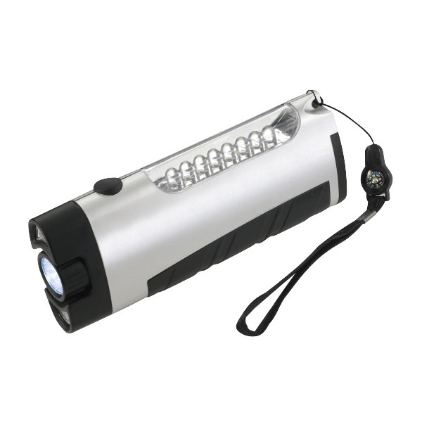 Linterna LED 4-en-1. Incluye Linterna 1 LED + Lámpara 8 LED + Estroboscópica roja de emergencia + Mini-Brújula en huincha negra removible para transportar.