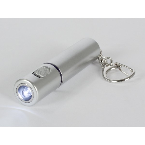 Llavero-Linterna LED plástica color plata. Usa 1 pila botón (incluida).