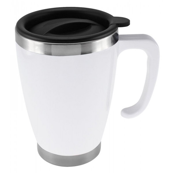 Mug térmico cónico de doble pared aislante con tapa pull-up de PVC negro y dosificador. Base interior de Acero Inoxidable y pared exterior de PVC.