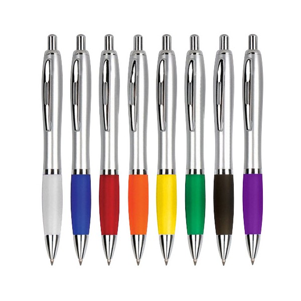 Bolígrafo plástico plateado con goma de color, modelo "Wind Satin". Escritura Azul. El Bolígrafo más famoso del mundo.