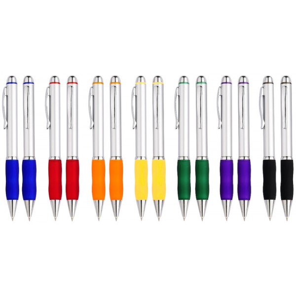 Bolígrafo plástico metalizado "Qasar" con goma de color. Escritura azul.