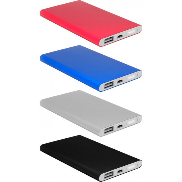 11 x 6,5 x 1 cm. Capacidad 4000 mah. Metálico. Power Bank. Cuerpo de color. Dos entradas: una USB y una mini USB. Botón de encendido y luces led indicadora de carga.
