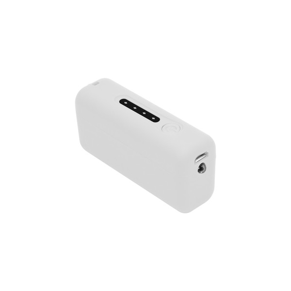 2,200 MAH 7,2 x 3,5 cm. Textura engomada, 4 luces indicadoras de carga, botón de power y linterna incluida.